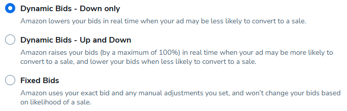 • 固定竞价:亚马逊使用您的确切出价和您设置的任何手动调整,并且不会根据销售可能性更改您的出价。