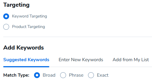 Helium 10 广告 允许您配置手动定向,您可以输入研究过的关键词或ASIN,或者使用亚马逊的自动定向,该功能将针对与您广告中产品相似/相关的产品的关键词和ASIN进行定向。当您对选择满意后,点击下一步按钮。