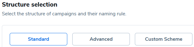 • 自定义方案: 定义您自己的广告活动结构和命名规则。
