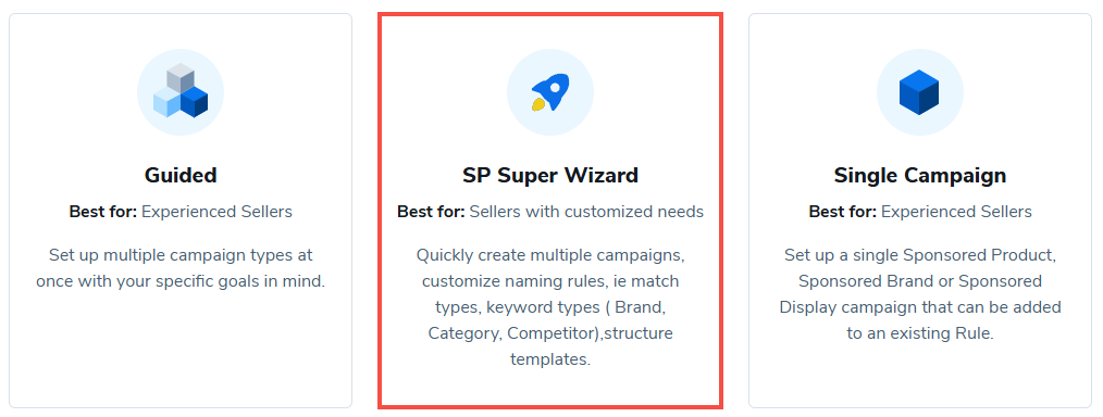 • 经验丰富的广告商现在可以使用新的SP超级向导批量创建赞助产品(SP)广告活动。此工具简化了广告活动创建,并提供三种策略模式——标准、高级和自定义——以适应您特定的广告目标。