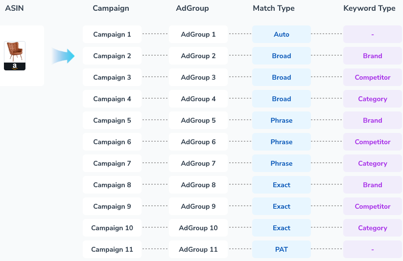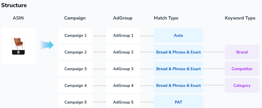 • 涵盖品牌、竞品、类目和PAT关键词的自动、广泛、短语和精确匹配类型。
