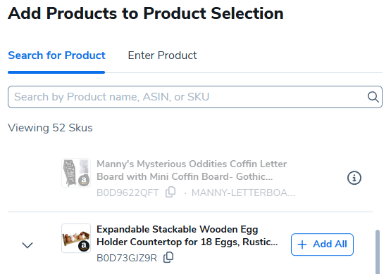 • 如果您的MWS令牌已连接,“产品选择”标签页将加载您账户关联的产品。如果您的MWS令牌未连接,您需要手动输入您的产品SKU。