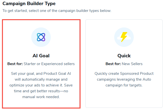 • AI目标功能可帮助您创建由Helium 10 AI驱动的赞助产品广告活动。设定明确的绩效目标,选择您的预算策略,然后让AI优化关键词定位、预算和出价,以最大限度地提高广告活动效果。