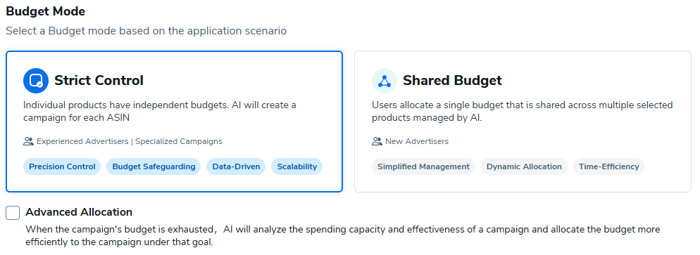 • 共享预算:分配一个总预算,由AI自动在所有选定的产品中进行分配。