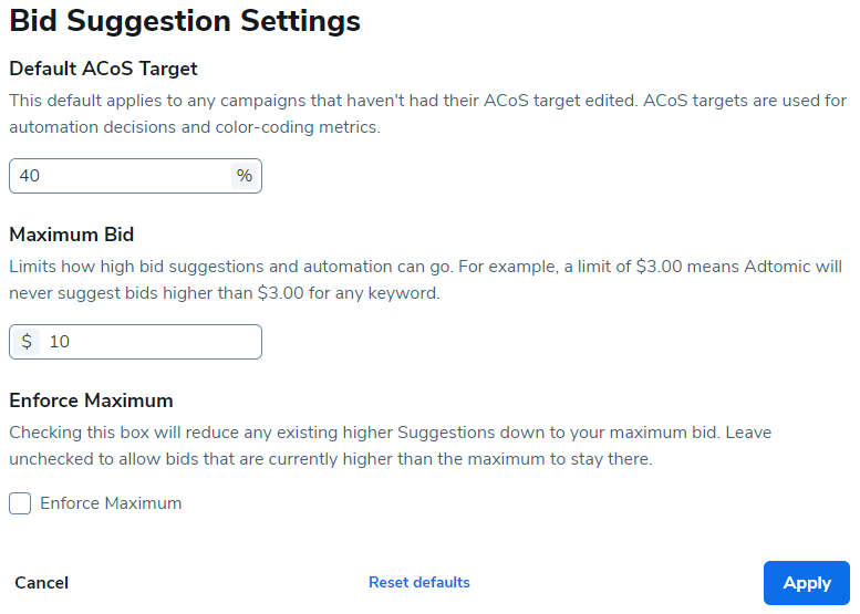- 限制出价建议和自动化可以设定的最高出价。例如,3.00美元的限制意味着H10广告永远不会建议任何关键词的出价高于3.00美元。