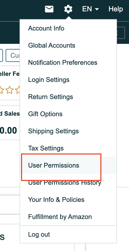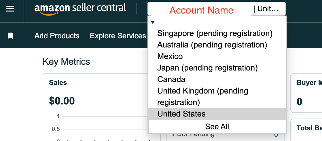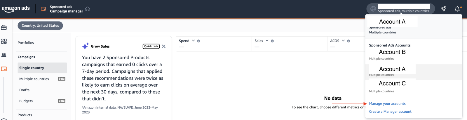 1. 登录卖家中心 sellercentral.amazon.com(或相应的市场)。通过选择账户列表下拉菜单并选择正确的账户,确保您正在查看希望授予广告权限的正确账户。