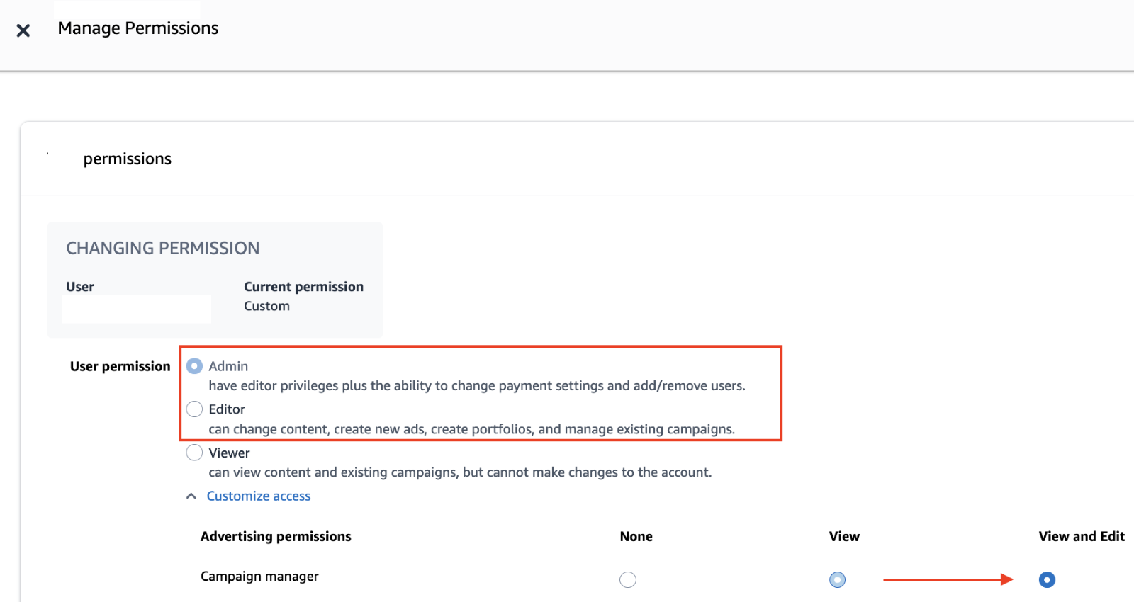 7. 确保次级用户在“用户权限”上拥有“管理员”或“编辑者”访问权限,并且在“自定义访问”下拉菜单下拥有“查看与编辑”访问权限。