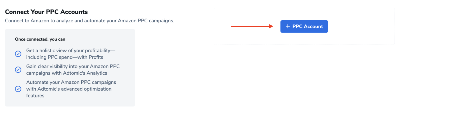 4. 在页面下半部分,“连接您的PPC账户”右侧,点击“+ PPC账户”。