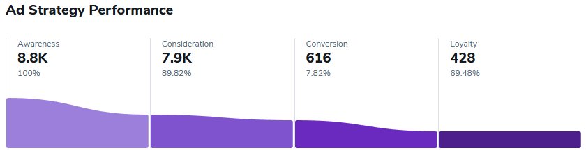 注意: 百分比是基于上一个细分群体计算的。例如:(根据下面的例子)7.82%的转化率是基于“考虑”细分群体的总数。69.48%的忠诚度是基于“转化”细分群体的总数。