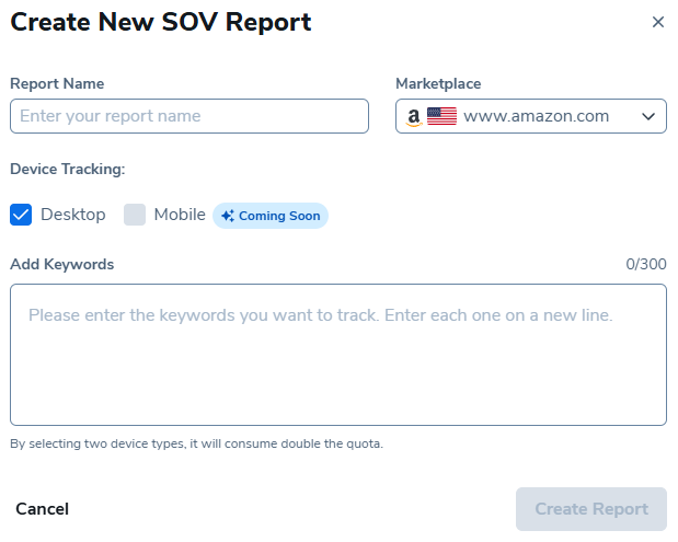2. 填写报告名称和市场字段,然后添加您的关键词。