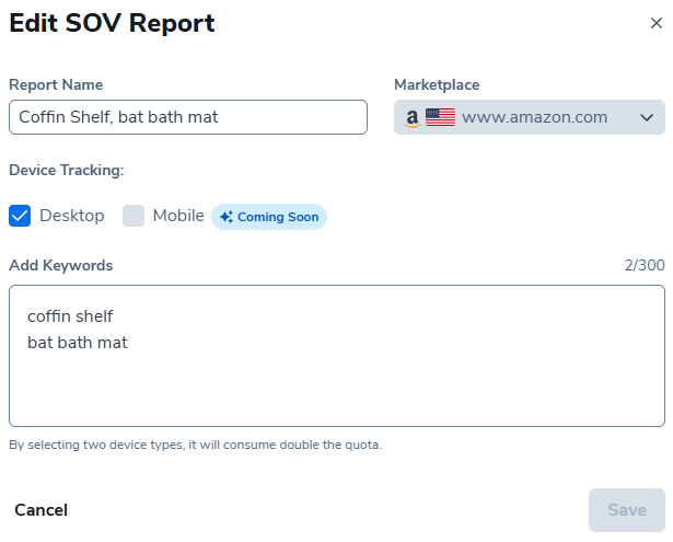 要编辑现有报告,请点击您希望编辑的报告旁边的图标。这将允许您编辑报告名称以及为该声量份额报告分析的关键词。点击右下角的保存以确认您的新编辑。