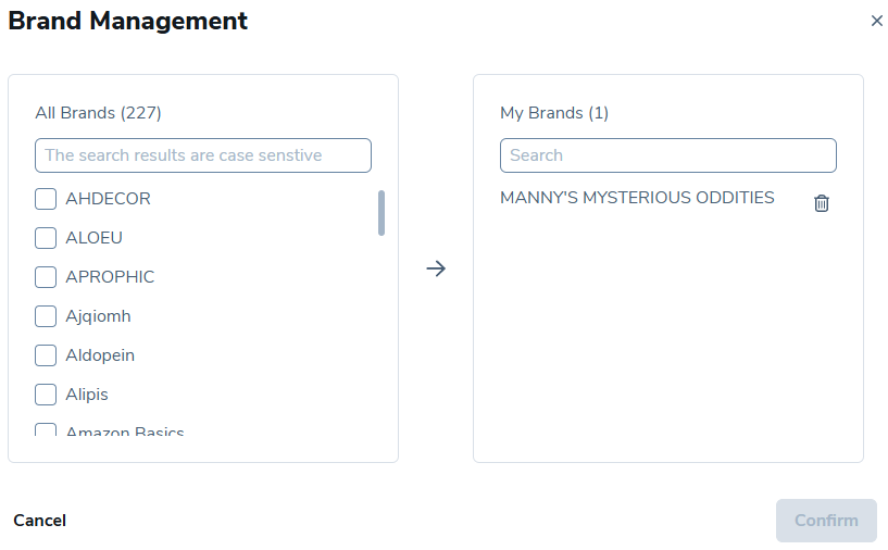要管理您报告中的品牌,请点击右上角的”品牌管理“按钮。这将允许您筛选报告中检测到的所有品牌,并在”我的品牌“列下将特定品牌设置为您的品牌。