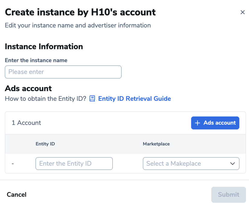 4. 输入实例名称、您的实体ID以及您希望为其创建AMC实例的市场