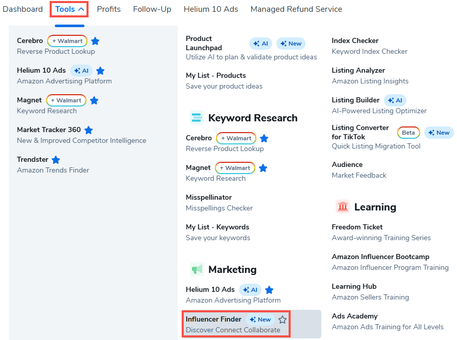 您可以在Helium 10仪表板的营销部分下找到影响者查找器。