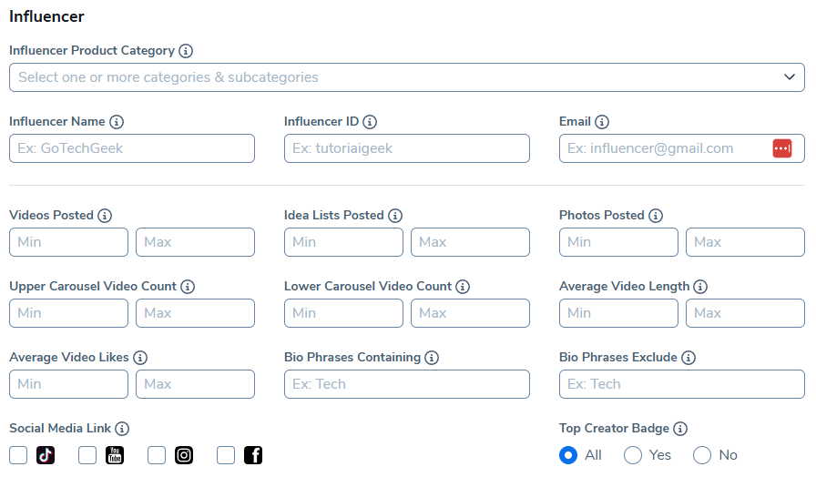无论您是推出产品、增加流量还是扩大品牌影响力,影响者查找器都简化了在您利基市场中寻找已经创作高影响力内容的影响者的过程。