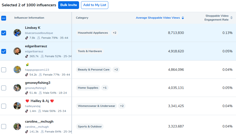 在工具的顶部,您会找到一个简单的切换按钮,可以在亚马逊和TikTok影响者之间切换。这允许您在同一体验中探索两个平台的影响者数据库——包括搜索、筛选和联系功能。