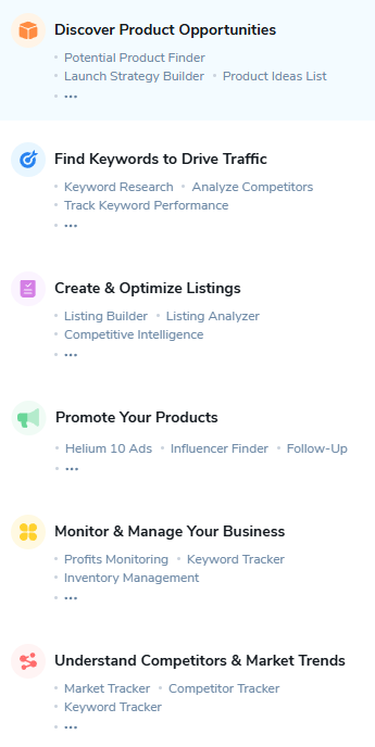 适合新用户或不熟悉Helium 10产品套件的用户,解决方案视图根据您的业务目标组织工具——让您更容易找到合适的解决方案,无需了解具体产品名称。