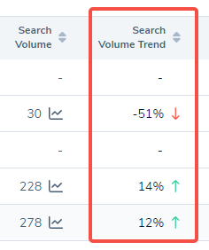 搜索量趋势列将当前搜索量数据与上个月的搜索量数据进行比较,提供一个快速指标,显示该关键词的趋势是正向还是负向。这有助于确定哪些关键词当前热门或冷门。