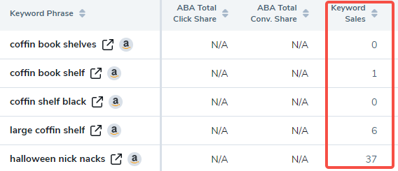 关键词销售列显示每个关键词产生的销售数量估计值。此指标基于亚马逊数据。