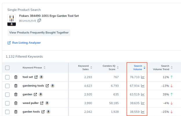 要使用此功能,请在Cerebro中搜索一个或多个ASIN,或在Magnet中搜索一个或多个关键词。在显示搜索结果的筛选关键词列表中,找到搜索量列。点击搜索量数字旁边的图表图标。