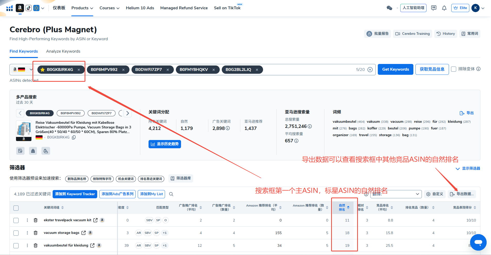 自然排名——当您搜索一个ASIN时,自然排名就是指当前搜索ASIN的自然排名;当您输入多个ASIN搜索时,自然排名是指搜索框中第一个标星主ASIN的自然排名,其他竞品ASIN的自然排名需要下载CSV文件查看,如图: