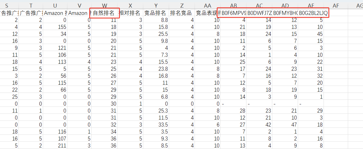 导出的CSV文档中,W列是第一个标星/主ASIN的自然排名,最后面四列是搜索框中4个竞品的自然排名。