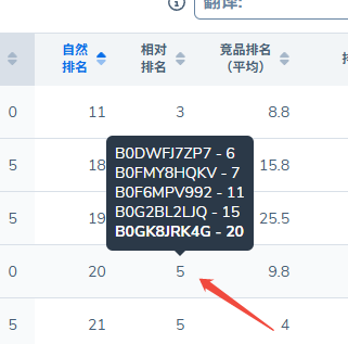 相对排名是指主ASIN相对其他竞品在这个关键词下面的排名。如下图鼠标悬浮在相对排名5上,可以看到这些ASIN的自然排名,其中粗体主ASIN的排名是20,20在所有ASIN的自然排名中大小排第5,即相对排名5。