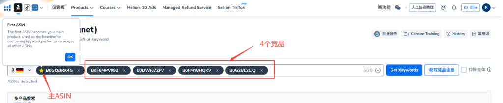 相对排名—— 当我们输入多个ASIN时,第一个标星ASIN被视为主ASIN,其他被视为竞品。如图,一共输入了5个ASIN,第一个标星ASIN是主ASIN,其他4个ASIN是竞品: